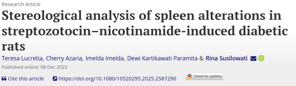 Departemen Histologi dan Biologi Sel kembali menorehkan prestasi akademik melalui publikasi artikel ilmiah berjudul “Stereological analysis of spleen alterations in streptozotocin–nicotinamide-induced diabetic rats”, yang terbit online ahead of print pada 8 Desember 2025 di jurnal internasional bereputasi Biotechnique & Histochemistry (https://doi.org/10.1080/10520295.2025.2587290)
